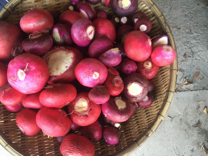 まずは、カゴに山盛りになった緋のカブの下ごしらえ。