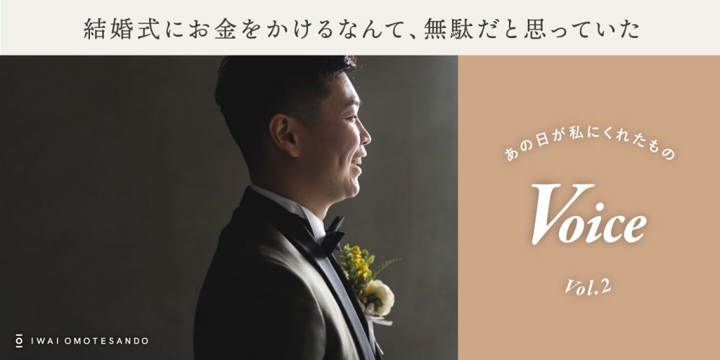 IWAI OMOTESANDO(以下、IWAI)の結婚式は、一般的な結婚式にある高砂や豪華な装飾、ケーキ入刀がなく、空間もプロセスもとてもシンプル。その分引き立つのは、人と人との関係性や想いです。この「Voice」シリーズでは、おふたりがどんな気持ちで当日を迎え、何を感じたのか。より臨場感をもってお届けするべく、ご本人への取材をもとに、おふたり目線での口語表現でお届けします。