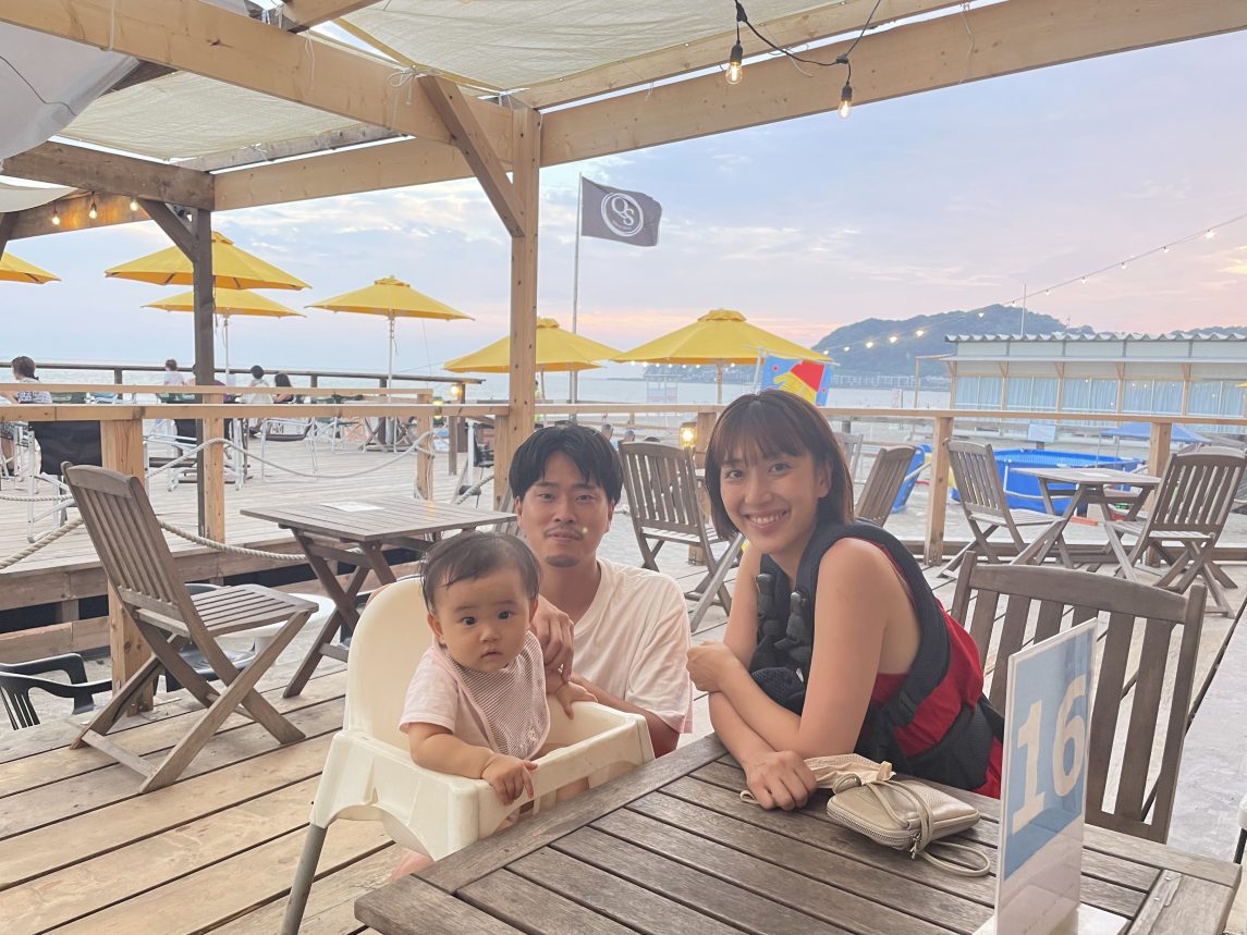 育休中の夫婦の裏テーマ(笑)。仕事終わりの旦那さんに、今日も沢山の成長を見せてくれた娘に、一緒に全力で遊んだ私に、お疲れ様!と皆で乾杯。自然の力を借りて、海を見ながら広い空の下でご飯を囲むと、会話も弾んでお互いに労わりあえる。