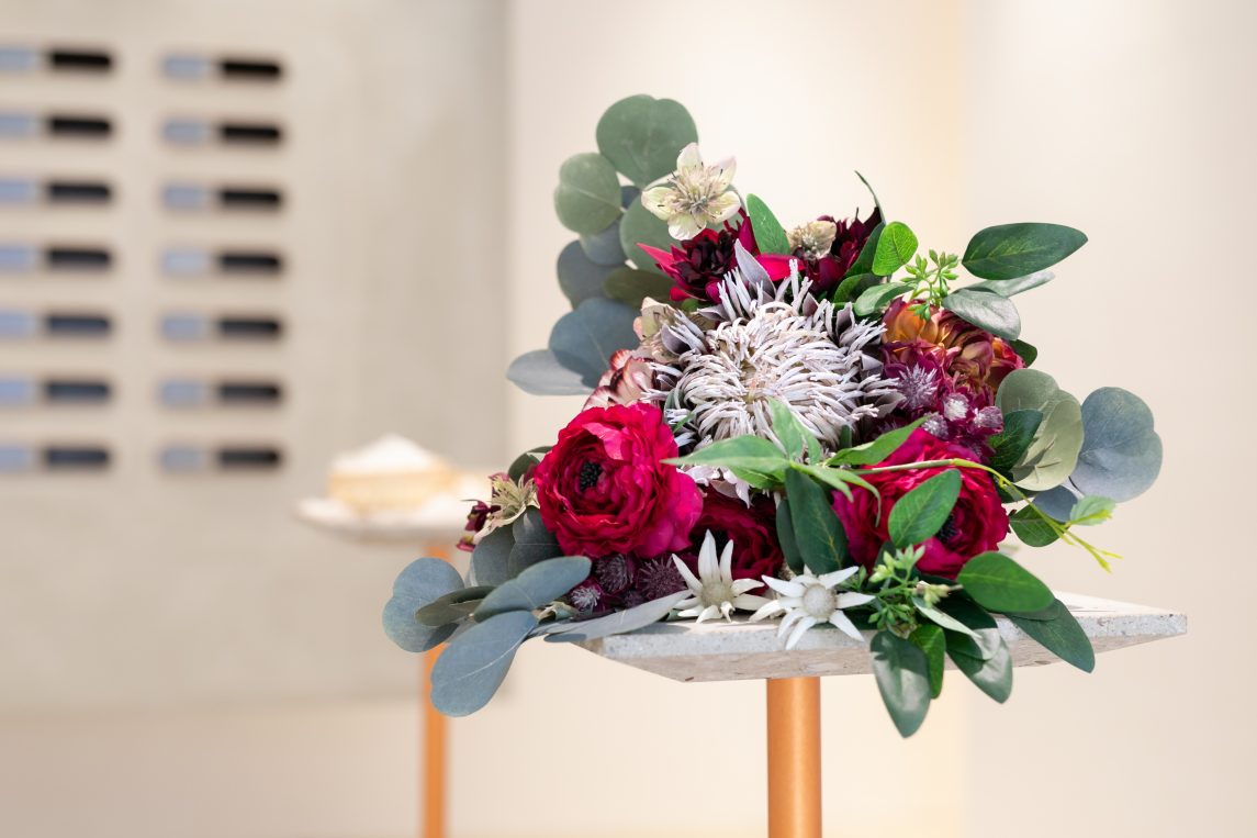 当日手元にそれぞれのブーケを持った上で、式場の入り口、最も人目につく位置に、未来に使う予定の2束のブーケを飾りました。