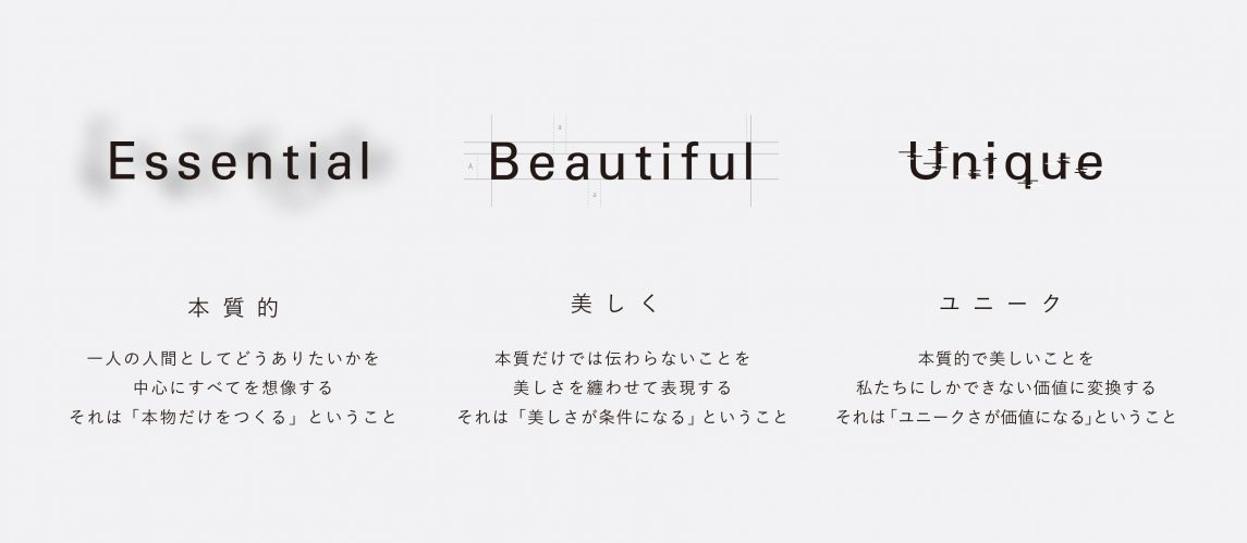 “まず何よりも先に、本質を選択することを経営の絶対条件としています。それは、地球にとって真に本質的なコトやモノを創造し、提供し、買い、大切にするということです。次に、その本質を、美しいデザインに変換して世の中に提供します。それは、外面的なデザインであり、内面的な人としての美しさです。私たちにとって成長すべき制約条件と言えます。最後に、本質性と美しさをユニークな存在感で世の中に提供していきます。私たちにしか出来ない価値であるかどうかが大切であり、ユニークさは私たちにとって意思決定基準になります。”