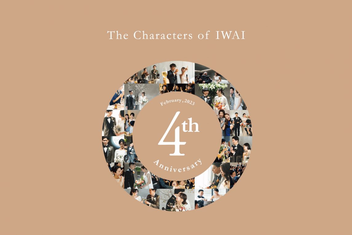 4周年を迎えた今、どんなメッセージを皆さまにお伝えしたいか、これまでを振り返りながらメンバー一同で考えました。この4年間、どこを切り取ってもおふたりの顔が浮かんできます。開業当初、誰も見たことのない結婚式を信じて理想と希望を持って挑んでくれたおふたり。コロナの渦が襲う中でも光を手放さず、新たな答えを共に見出してくれたおふたり。IWAIは“おふたり”で出来ていると、思わずにはいられませんでした。IWAIを共につくってくださった、お客様を越えたお客様。結婚式を挙げてくださった一人ひとりがIWAIの4年間の物語に欠かせない存在。そんな思いを「The Characters of IWAI-あなたはIWAIの登場人物-」という言葉に込めました。
