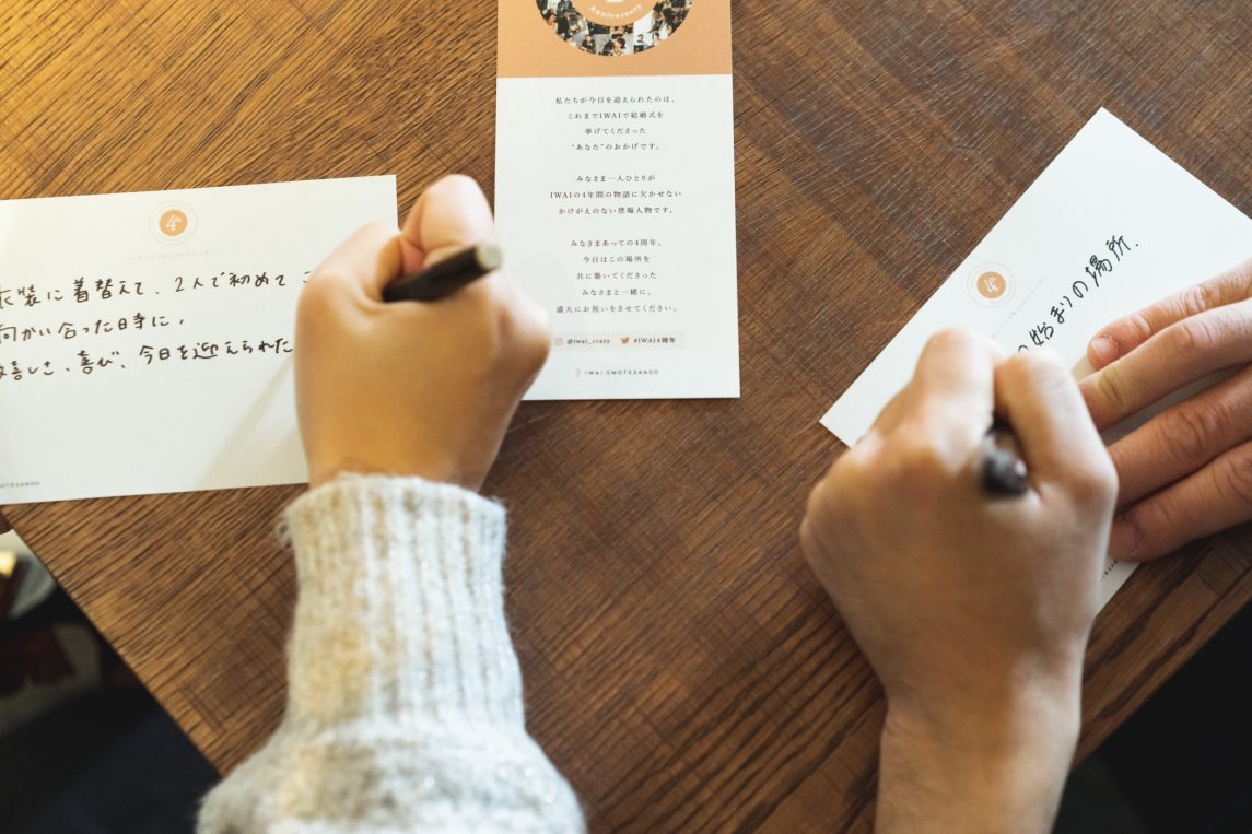 私たちは周年の節目を、IWAIでご結婚式を挙げてくださったおふたりに、あらためて感謝をお伝えする大切な機会と捉えています。今日までIWAIがあり続けられるのは、ひとえに支えてくださる皆さまのおかげです。そんな心からの想いを込めて、毎年周年の時期には皆さまとIWAIで築いたこれまでの日々を共にお祝いさせていただく時間をご用意しております。