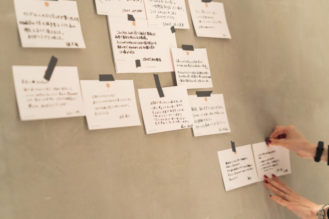 そんな問いかけが書かれたカード。IWAIとのストーリーを振り返りながら、皆さまの文字でエピソードが綴られます。物語を載せたそのカードは、館内の思い出の場所へ貼っていただきました。