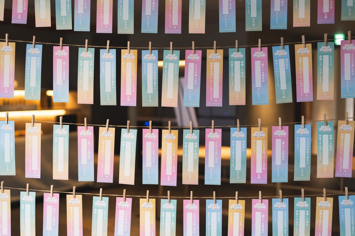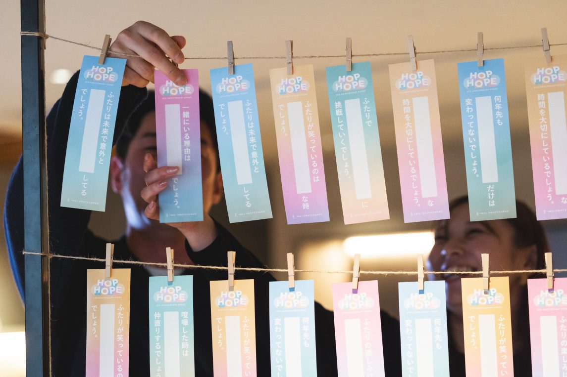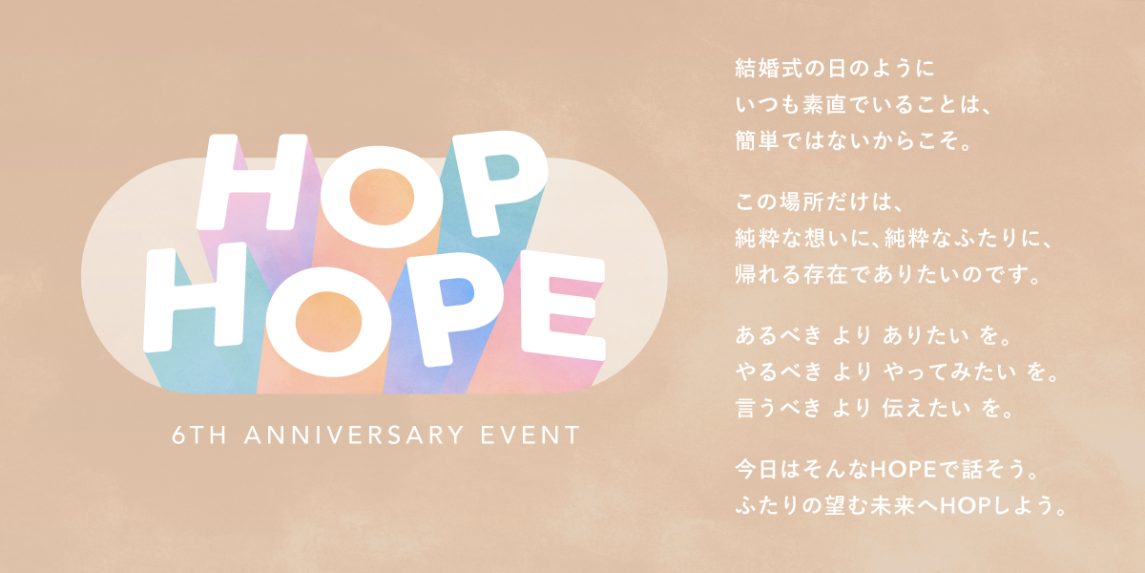 だからこそ、純粋な想いで人生を見つめたこの場所では、一度立ち止まって心の声を大切に聴いたり、その想いをパートナーと素直に伝え合ったりして、また未来への希望でこころが弾む時間を過ごしてほしい。そんな願いを込めて「HOP HOPE」というイベントコンセプトを紡ぎました。