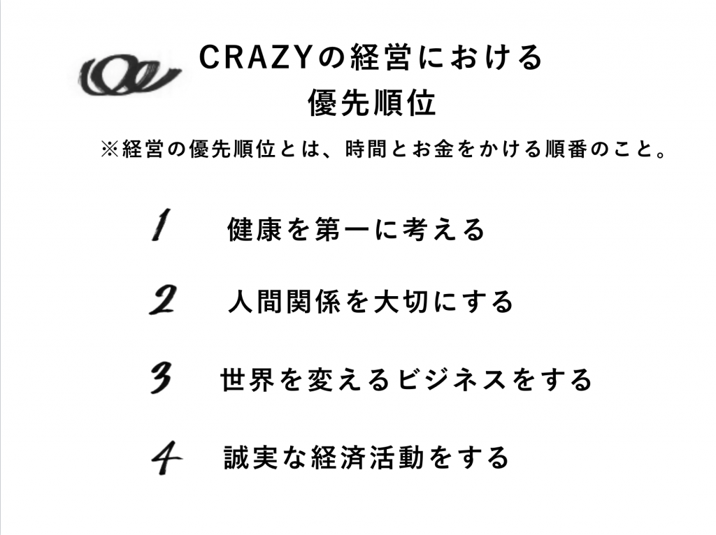 CRAZYでは、「人間のしあわせ=ウィルビーイング」そのものが存在意義のひとつだ。その前提を踏まえ、経営の優先順位のひとつめは「健康を第一に考える」こと。ふたつめは「人間関係を大切にする」こと。そのうえで「世界を変えるビジネスをする」「誠実な経済活動をする」という順番にしている。