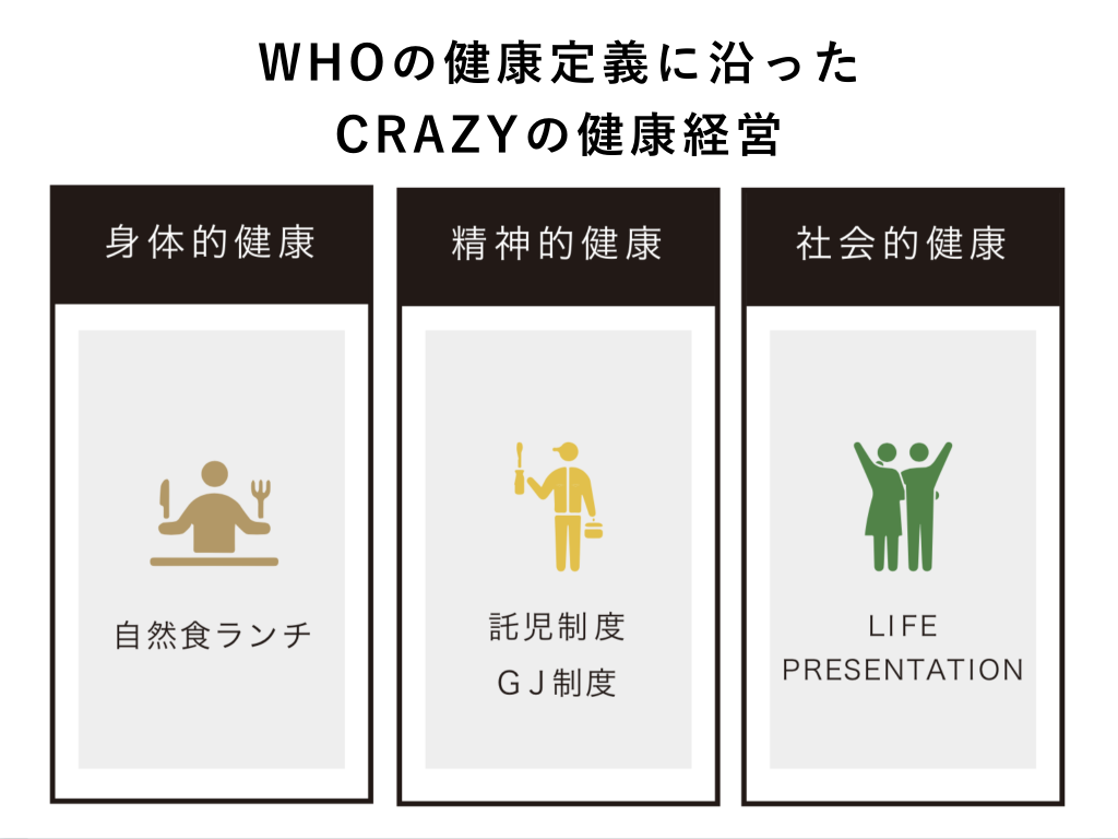 身体的健康として「自然食ランチ」、身体的健康として「託児制度」、社会的健康として入社前に自分の人生についてプレゼンテーションする「LIFE PRESENTATION」がある。