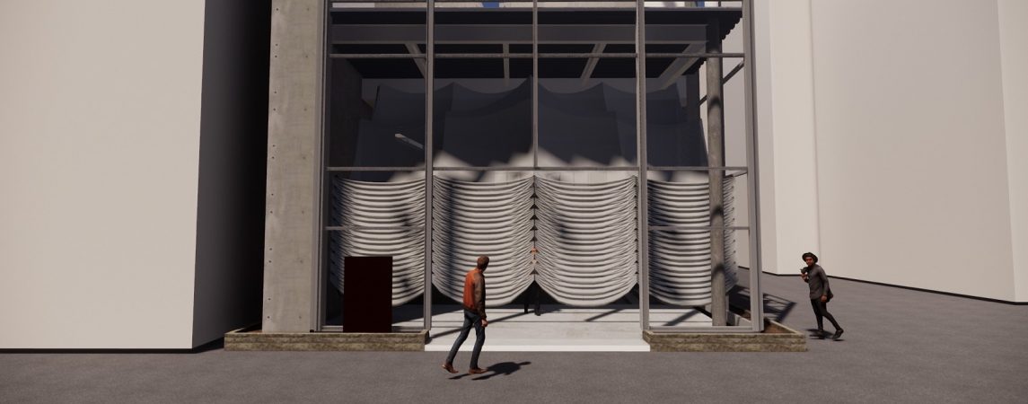 それは、舞台装置を作ることです。奥が1階、僕が2階とエントランスの天幕、八木が3階のイベントホール「BENE- 」と、それぞれ役割を持って、劇場を表現する装置=エレメントを作りこみました。