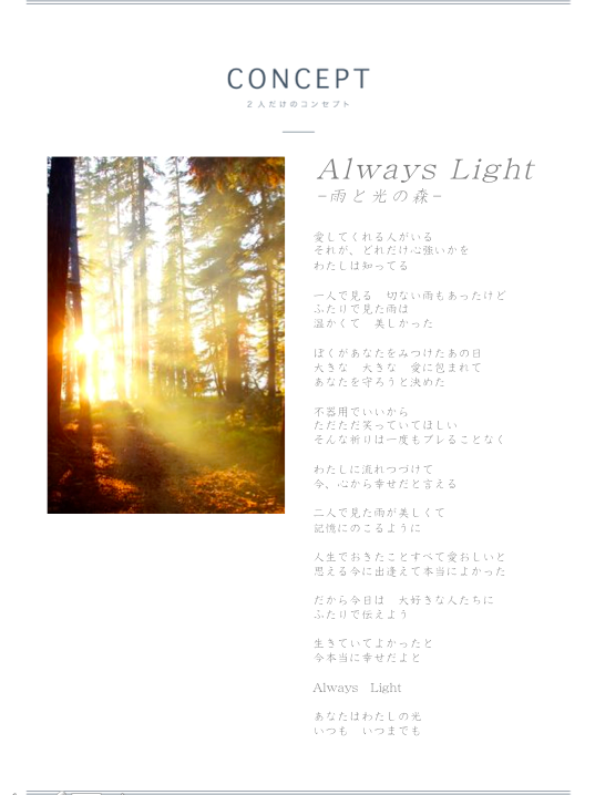 彼女は幼いころに自分を置いて家を出た母親がいて。定期的に会ってはいたものの、一度大きくぶつかりあったことをきっかけに4年間音信不通だったのね。ヒアリングでは、そんな母親を許せない気持ちや、自分は愛されていないと感じていたことを泣きながら話してくれて。新郎さんもそんな彼女を守りたい、という気持ちがとても強かった。だからふたりにとって親御さんと向き合うことそのものが結婚式の大事な要素だと思ったの。そして、二人だからこその、弱さを強さに変えられる力を言葉にしたの。そうして紡いだコンセプトが「Always light -雨と光の森- 」。