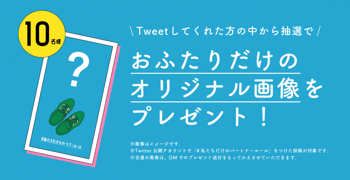 「#私たちだけのパートナールール」をTwitterで投稿いただいた方の中から、抽選で10名様へ、おふたりだけの「#私たちだけのパートナールール」オリジナル画像をプレゼントいたします。