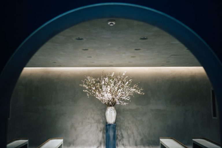 挙式を行う「セレブレーションホール」の建築は、大切な人同士の人生が交錯していくことを表現しています。壁と天井の角は丸みがかかり、天井の特殊な間接照明により、非日常な体験ができます。