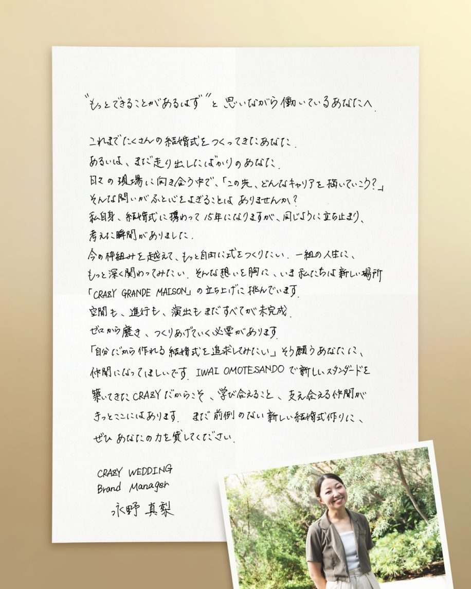 「大勢のウエディング経験者へ」ではなく、まだ見ぬ「未来の大切な仲間になるあなたへ」のメッセージを届けたく、求人情報ではなくお手紙を綴りました。