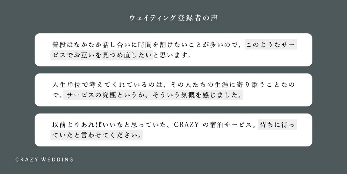 CRAZY ANNIVERSARYは、2024年2月からCRAZY WEDDINGにて結婚式を挙げたおふたりに向けてウェイティング登録を行っており、現在200組のカップルにご登録いただいています。ウェイティング登録をしてくださっているお客さまからのコメントを、一部紹介します。