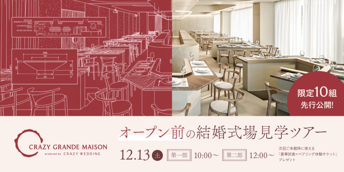 このツアーでは、完成前の空間を特別に公開し「CRAZY GRANDE MAISON」の挙式からパーティーまでの流れや過ごし方を、いち早くイメージしていただける体験をお届けします。