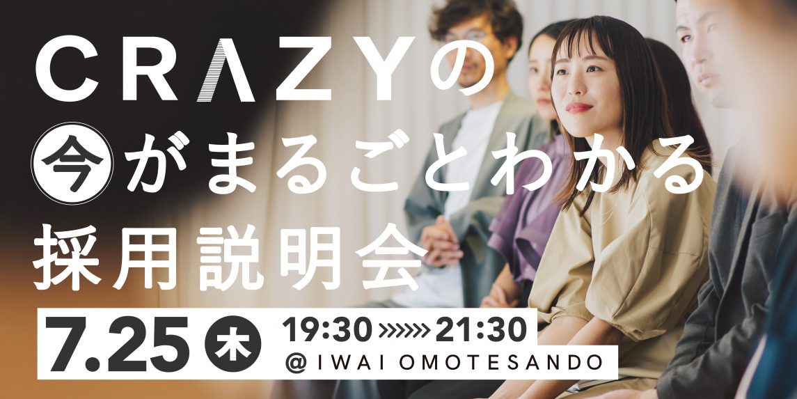 代表の森山が登壇し、事業や組織カルチャーをはじめとしたCRAZYの“今”をありのままにお伝えします。CRAZYの採用にご興味をお持ちの方はぜひご参加ください。