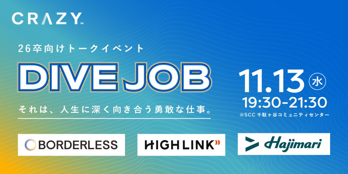 11月13日(水)、26卒の学生に向けて、人生に深く向き合う企業と出会える就活トークイベント「DIVE JOB」を開催いたします。