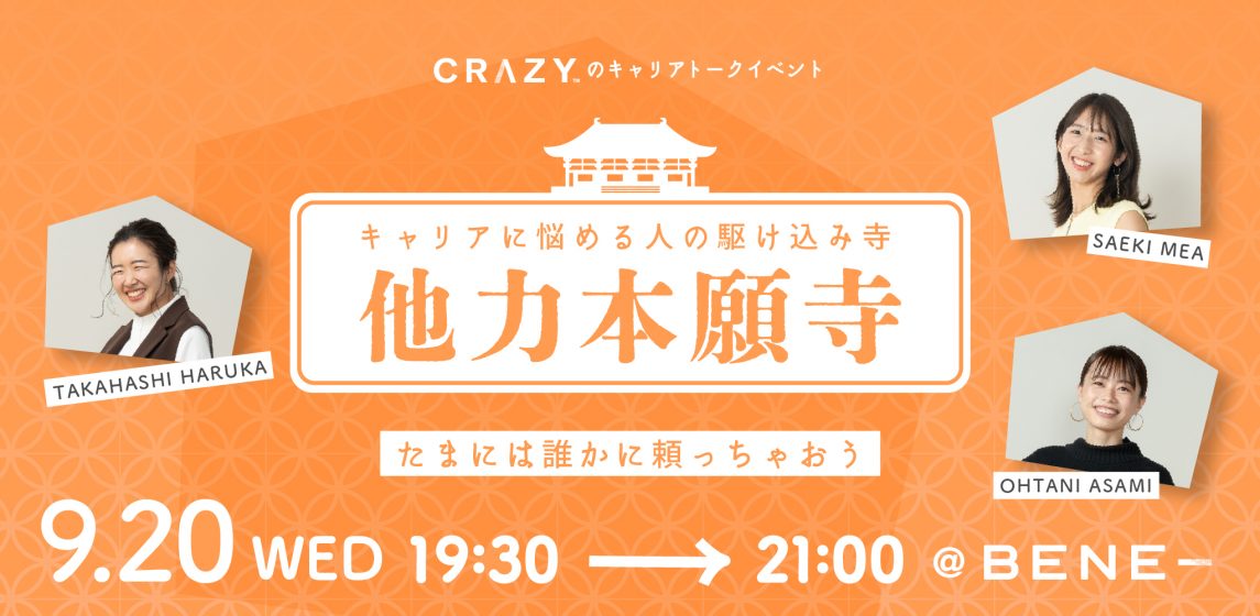 9月20日(水)、CRAZYが運営する自社会場「BENE-」(表参道)にて、キャリアトークイベント「他力本願寺」を開催いたします。