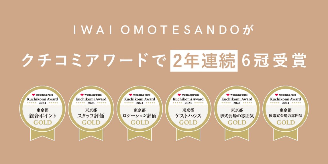 IWAI OMOTESANDO(以下IWAI)は、「ウエディングパーククチコミアワード 2024」内の6部門※において都内約900会場の内、最も評価の高いGOLDを受賞いたしました。本アワードの受賞は、2023年に続き2年連続となります。
