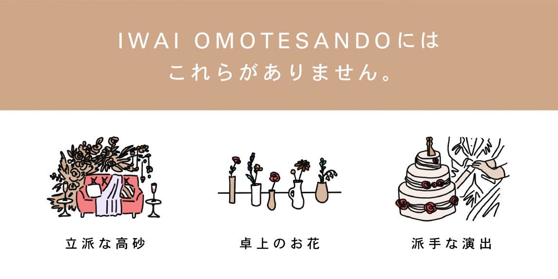 IWAIでは、おふたりを主役だと感じさせる「高砂」がありません。おふたりのお席は、ゲストと同じテーブルの中にあります。このように「ゲストと主役」というこれまでの結婚式にあった境界線を視覚的に無くすことで、互いに肩肘をはらず、自然体な状態で会話を楽しむことができます。
