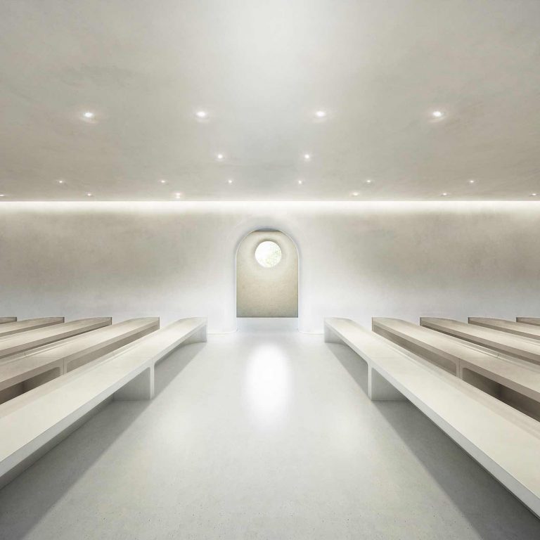 西館と東館2棟の建物の中央には、表参道から続く明治神宮と同じように古来より存在する森を再現した“IWAIの森”をつくりました。その森を抜けると、セレブレーションホールへと進みます。セレブレーションホールの建築は、大切な人同士の人生が交錯していくことを表現しています。壁と天井の角は丸みがかかり、天井の特殊な間接照明により、非日常が体験できます。ゲストの皆さまが向かい合って座るスタイルで、人生を支えてくれた大切な方々を証人に、一生添いとげる相手に対する誓いをたてます。