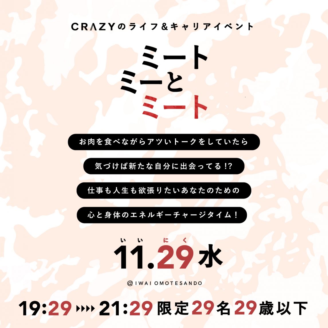 ・11/29(水)19:29〜21:29 美味しいお肉と、アツいトークでお腹も心も満たすライフ&キャリアイベント「ミートミーとミート」