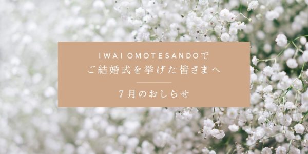 本NEWSでは、IWAI OMOTESANDOで結婚式を挙げてくださったOBOGの皆さまへ、IWAI OMOTESANDOからのご案内をお届けいたします。