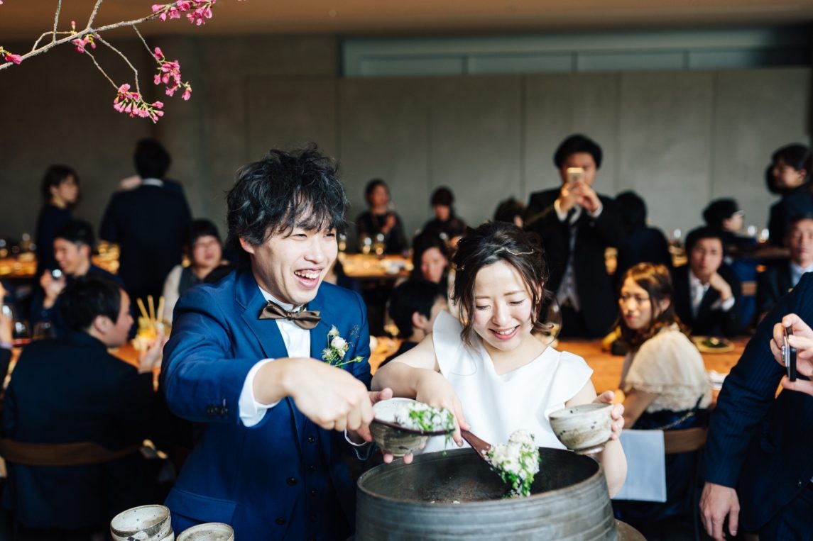 “人と人とを結ぶ”お祝いの場に特化して作られた醸造酒です。お祝いで人と人とが繋がる場所「IWAI OMOTESANDO」では、お祝いの場に集う人たちがその後も繋がり続けることを願い、“同じ釜の飯を食う”ということわざになぞらえて、締めに釜飯を提供しています。