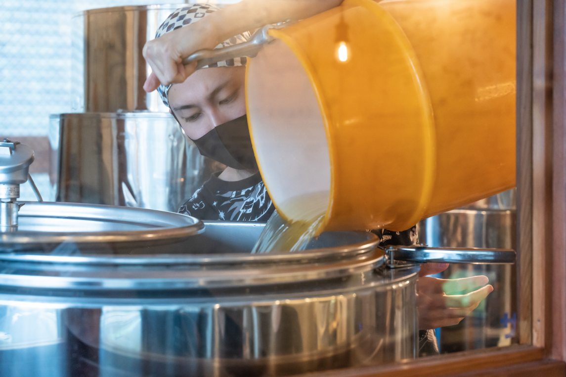 ※醸造過程で昆布と鰹節の合わせ出汁を加えている様子