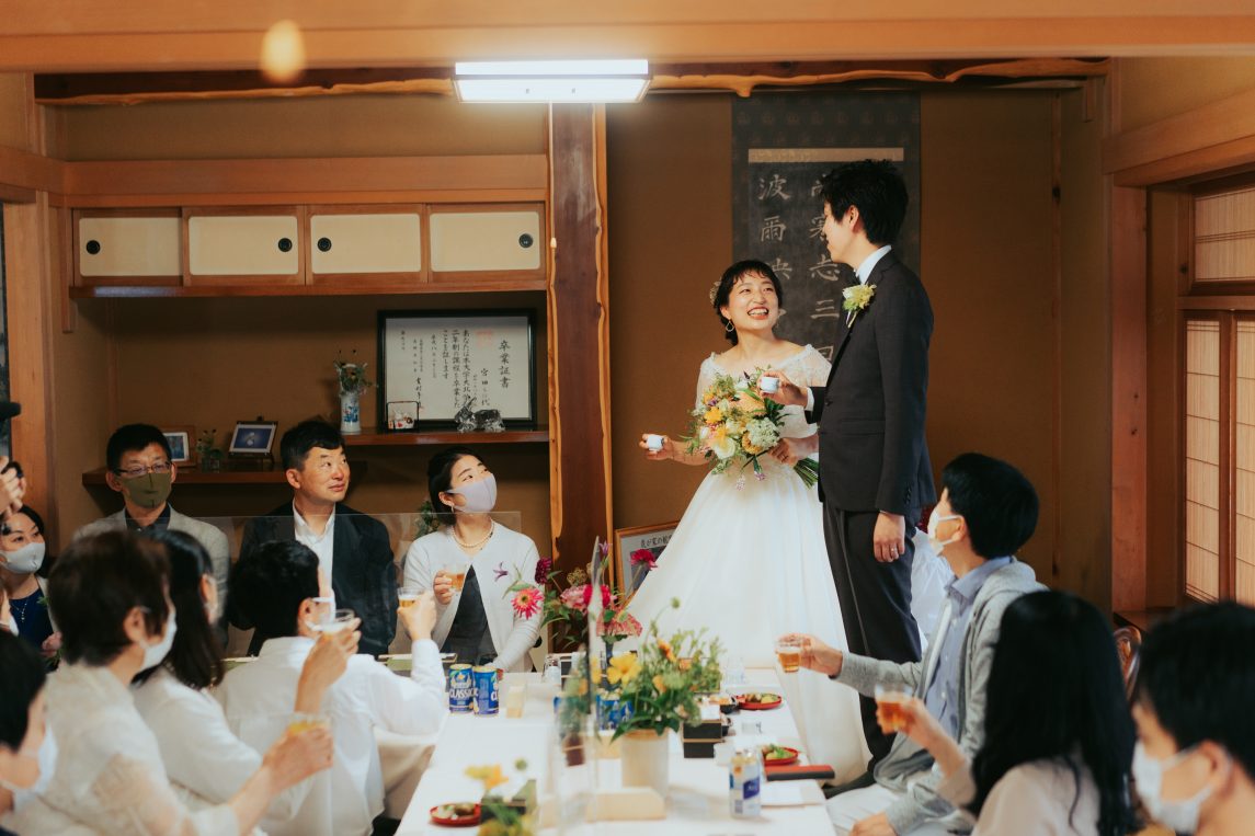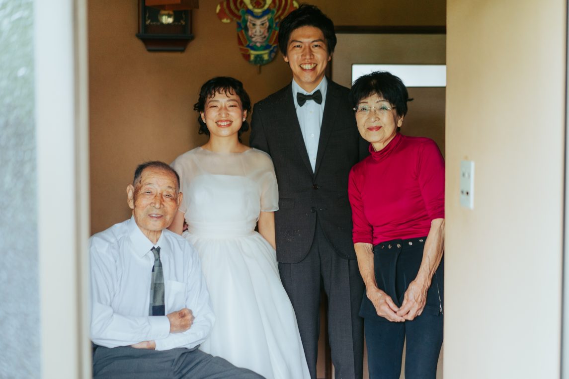 取材に応じてくださった新郎新婦様は、2021年6月に結婚式を開催されたおふたり。コロナ禍でも、お祖父様に晴れ姿をみせたい。本当に大切な人へ感謝を伝えたい。というお気持ちで式場ではなく、思い出深いご家族のお家で結婚式を挙げられました。