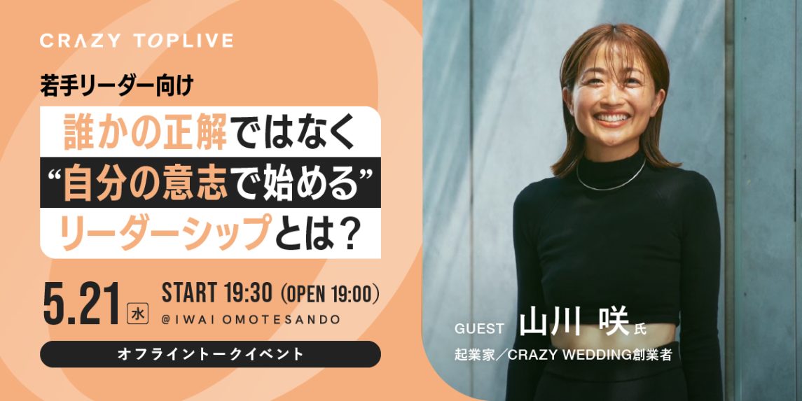 5月21日(水)、CRAZYのトップと他業種のトップが人生やキャリアの哲学を語り合うトークイベント「CRAZY TOPLIVE」を開催いたします。