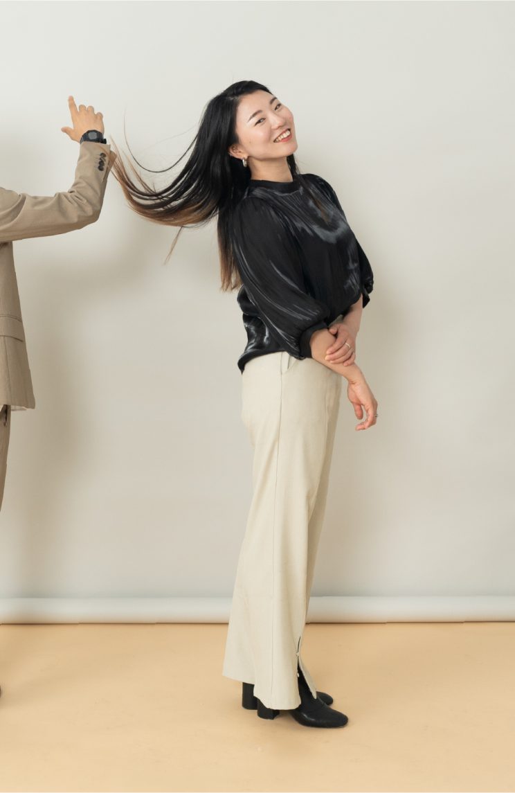 一目見た時、彼女の周りには海外の風が吹いていた。颯爽として、凛として、かっこいいスマートな女性。ただ彼女のそばにいると、だんだん愛おしさが増してくる。いつも人懐っこくて顔を合わせる時は溶けるような笑顔を向けてくれたり、よい仕事ができた!とキラキラした目で伝えてくれたり、仲間の頑張りに涙したりする。つまり純粋さのかたまり。愛情深く、相手を尊重し、純粋に貪欲に成長し続けられる誠実さ、このすべてを持っている。でっかい人間になるに決まっている素質を持って、今日も右往左往しながら本気で生きる。国も、人もボーダーを超えて、活躍する彼女の未来が楽しみ。