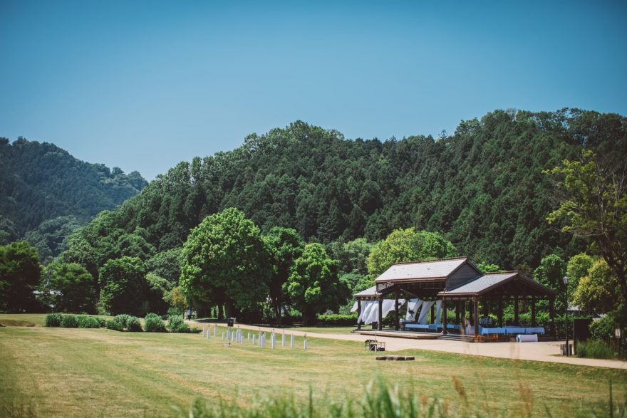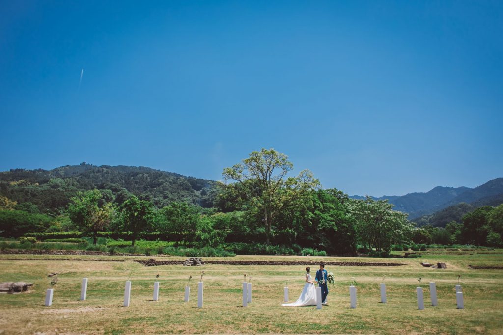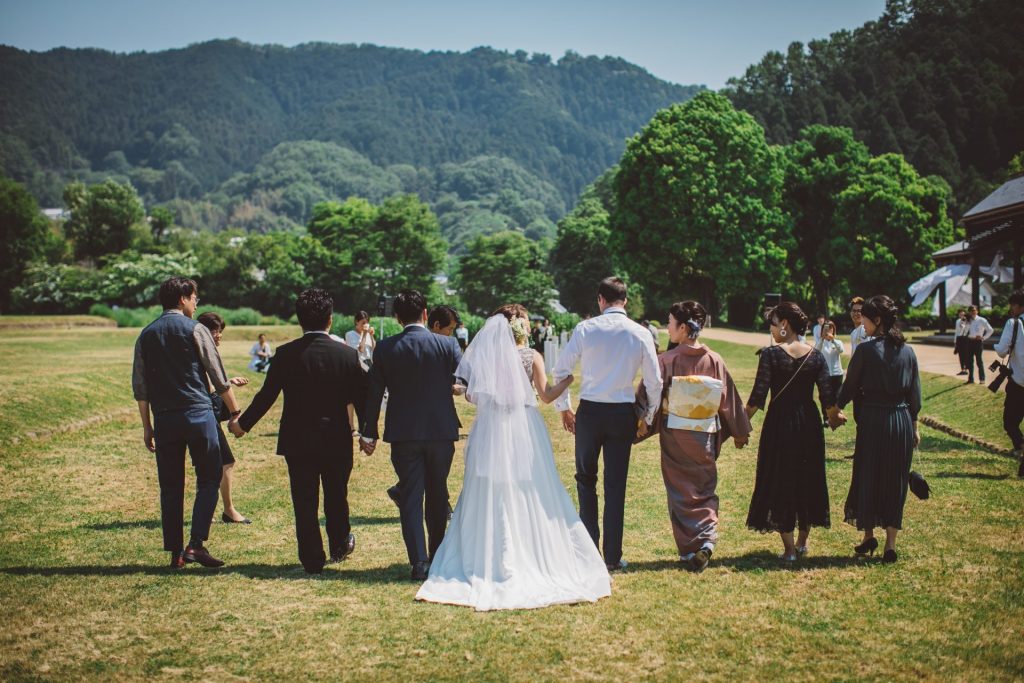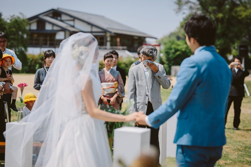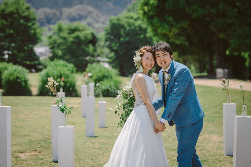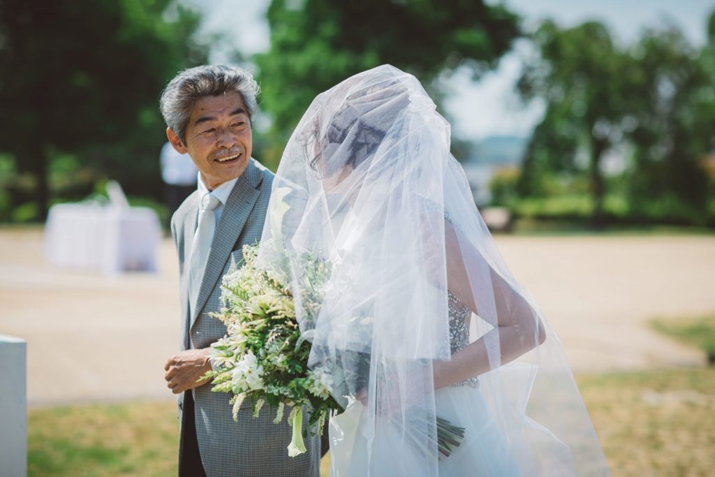 大阪にお住まいで、製造業にお勤めの陽気な新郎様と、芸大出身で姉御肌な新婦様。たくさんの希望がこの結婚式の原点にありました。「病の父に結婚式を見せたい」と語る新郎様。「祖父母に花嫁姿を見せるため、どうしても地元の明日香村で結婚式をしたい」と語る新婦様。そして、「天国から見守る新婦の妹様の分まで、バージンロードを共に歩きたい」と語る新婦お父様。奈良県明日香村の広大な芝生が広がる国営公園にて行われた結婚式です。
