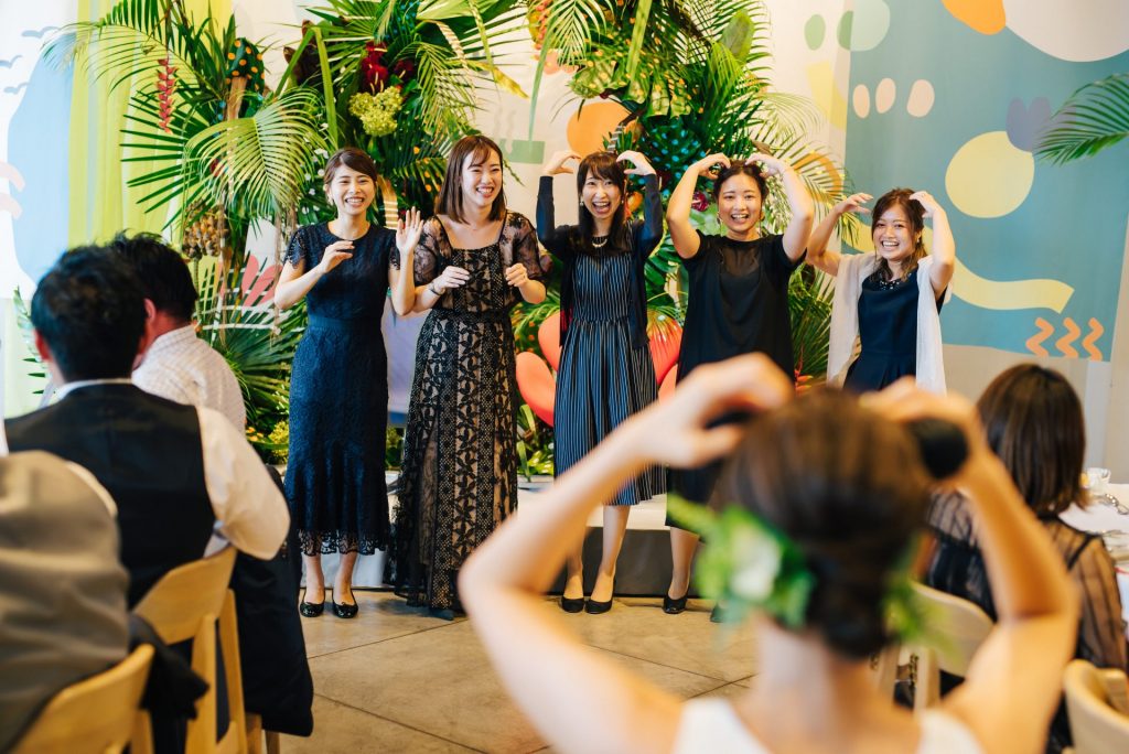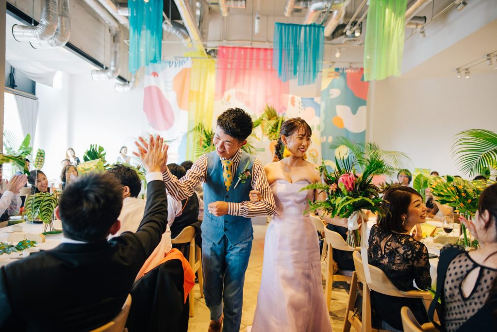 とにかくゲストと楽しみたい、結婚式じゃなくてまるでイベントに参加した時のように楽しかったー!と言ってもらいたい。そんなお二人の結婚式は、とにかく明るく楽しい1日に。