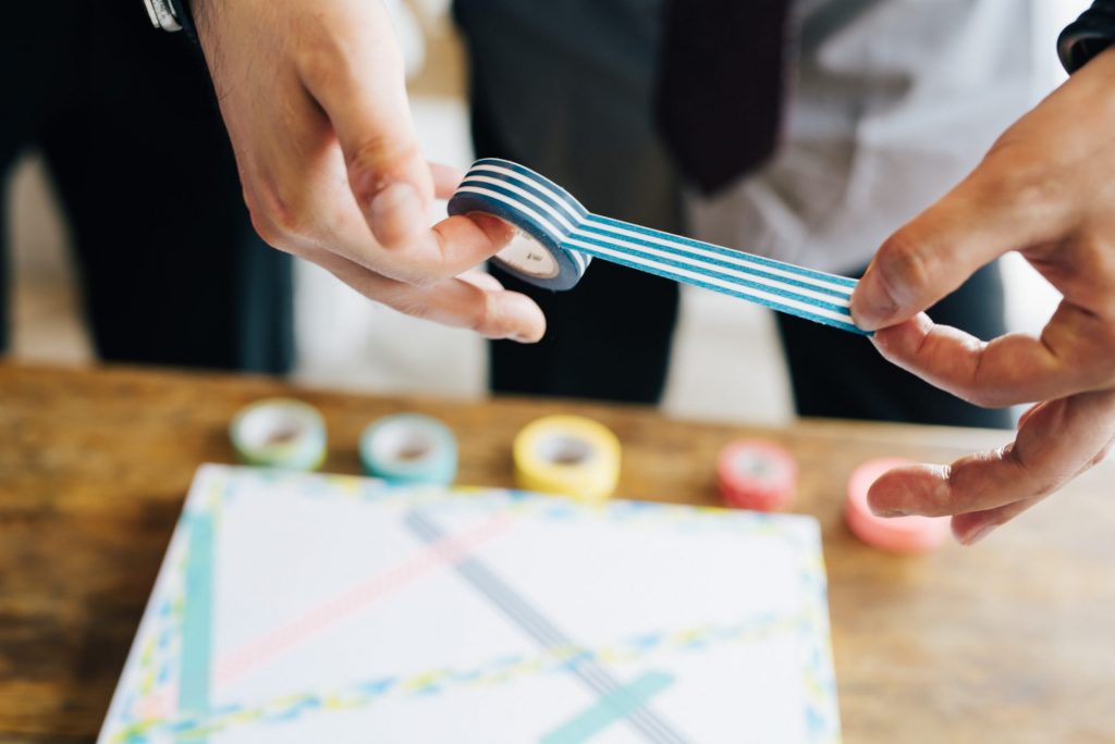 二人の結婚誓約書もゲストに作ってもらいました。二人で初めてチャレンジしたいことの6つの候補から、ゲストが一番チャレンジしてもらいたいものにマスキングテープを貼ってもらう形で投票。ゲストの皆さんはノリノリで、キャンバスの裏まで貼ってくれました。結果、新郎新婦はホノルルマラソンにチャレンジすることに!