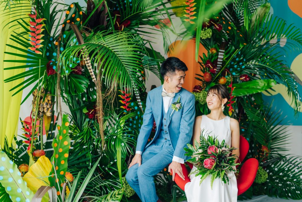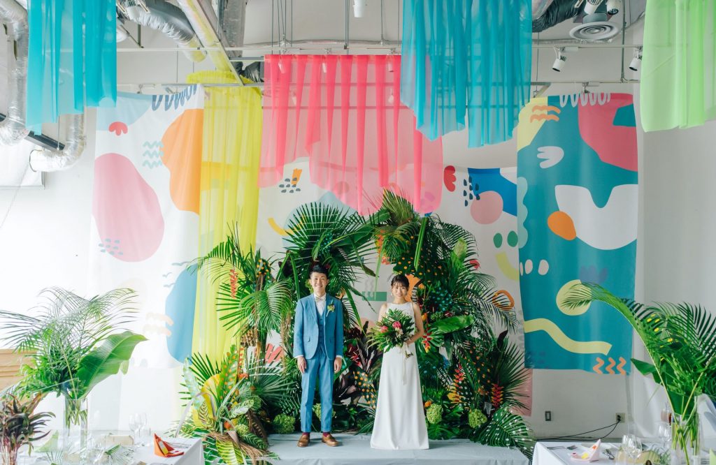 装飾は、「こんなの初めて!」という言葉が飛び交うように、見たことのない植物や抽象的なカラフルな模様を散りばめました。色鮮やかで今までにない空間装飾になりました。