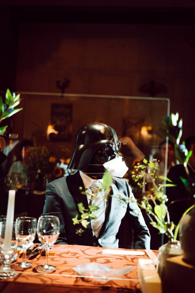 感染対策の衝立やマスク着用など今までの結婚式との違いも 思いがけないダースベーダーの出現や アクリルバリアでの記念写真と、ゲストの遊び心によって思い出のエピソードに。 おひらき時には全ゲストのポートレート写真を、 本日の「キャスト表」として飾り、この日のフィナーレを飾りました。