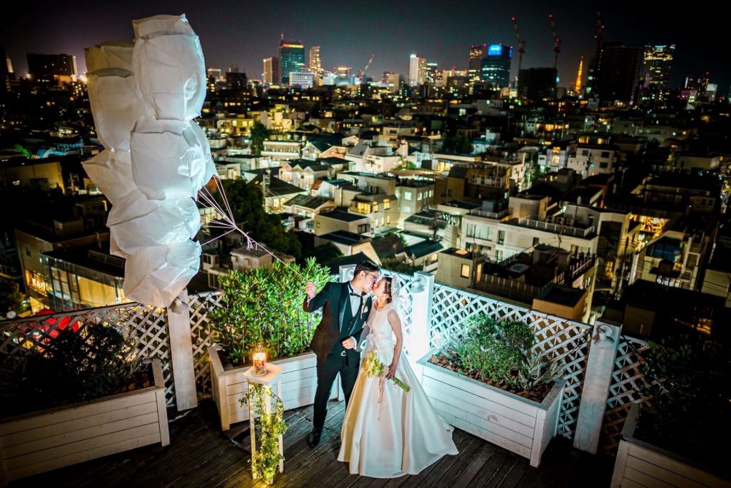 ④トワイライトにかけて行ったテラス挙式のフィナーレ時には、CRAZY WEDDING初の試みとなるランタン飛ばしをゲスト共に
